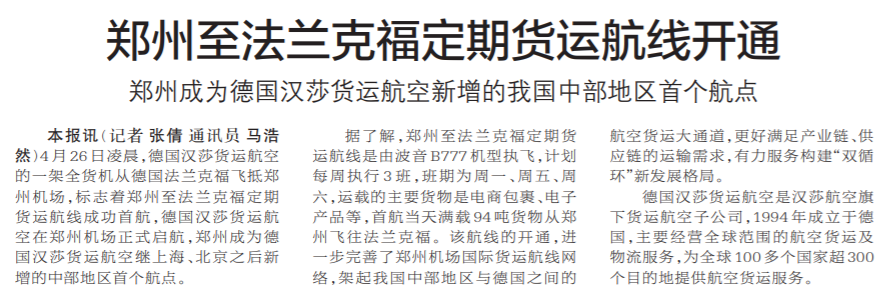 4月26日凌晨,德国汉莎货运航空的一架全货机从德国法兰克福飞抵郑州机场,标志着郑州至法兰克福定期货运航线成功首航,德国汉莎货运航空在郑州机场正式启航,郑州成为德国汉莎货运航空继上海、北京之后新增的中部地区首个航点。(今日《郑州日报》1版)