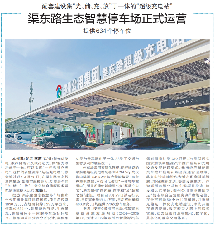 集光伏发电、液冷储能以及液冷超充、快/慢充等功能于一体,可以实现“一杯咖啡充满电”,这样的新能源车“超级充电站”,你体验过吗?4月26日,在渠东路生态智慧停车场,郑州市规模最大、功能最全的“光、储、充、放”一体化综合能源服务示范站正式投入运营(如图)。(今日《郑州日报》2版)