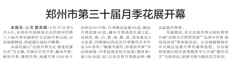 4月27日至5月9日,由郑州市园林局主办的郑州市第三十届月季花展将在主会场月季公园,分会场植物园、西流湖公园拉开帷幕。 (今日《郑州日报》2版)