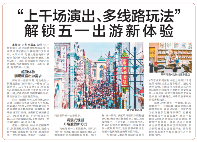 五一假期将至,市民出游热情持续高涨,河南多家景区推出丰富的假日文旅活动。4月26日,记者从建业电影小镇和只有河南·戏剧幻城两家景区了解到,用上千场好看的演出与全新的玩法线路,为游客朋友带来一场好玩、好看、好逛的五一之旅。(今日《郑州日报》4版)