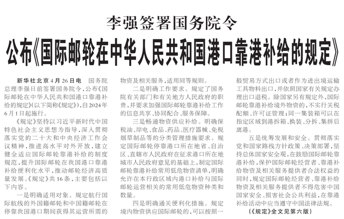 国务院总理李强日前签署国务院令,公布《国际邮轮在中华人民共和国港口靠港补给的规定》,自2024年6月1日起施行。(今日《人民日报》2版)