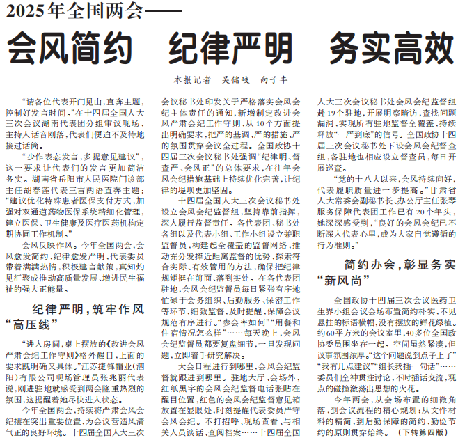 “少作表态发言,多提意见建议”,这一要求让代表们的发言更加简洁务实。湖南省岳阳市人民医院门诊部主任胡春莲代表三言两语直奔主题:“建议优化特殊患者医保支付方式,加强对双通道药物医保系统精细化管理,建立医保、卫生健康及医疗医药机构定期协同工作机制。”(今日《人民日报》1版、4版)
