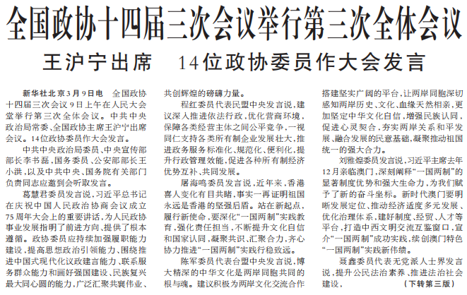 全国政协十四届三次会议9日上午在人民大会堂举行第三次全体会议。中共中央政治局常委、全国政协主席王沪宁出席会议。14位政协委员作大会发言。(今日《人民日报》1版、3版)