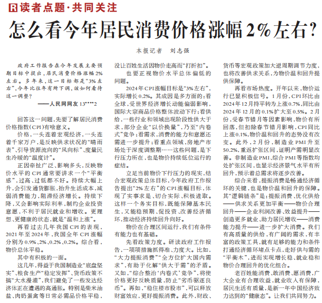 政府工作报告在今年发展主要预期目标中提出,居民消费价格涨幅2%左右。多年来,这一目标都是“3%左右”,今年比往年有所下调,该如何看待这一调整?