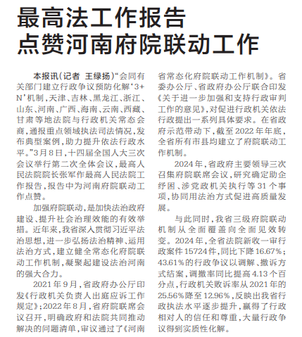 “会同有关部门建立行政争议预防化解‘3+N’机制,天津、吉林、黑龙江、浙江、山东、河南、广西、海南、云南、西藏、甘肃等地法院与行政机关常态会商,通报重点领域执法司法情况,发布典型案例,助力提升依法行政水平。”3月8日,十四届全国人大三次会议举行第二次全体会议,最高人民法院院长张军作最高人民法院工作报告,报告中为河南府院联动工作点赞。(今日《河南日报》1版)