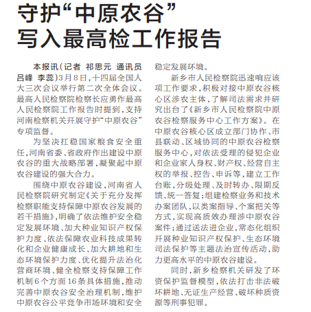 3月8日,十四届全国人大三次会议举行第二次全体会议。最高人民检察院检察长应勇作最高人民检察院工作报告时提到,支持河南检察机关开展守护“中原农谷”专项监督。(今日《河南日报》1版)