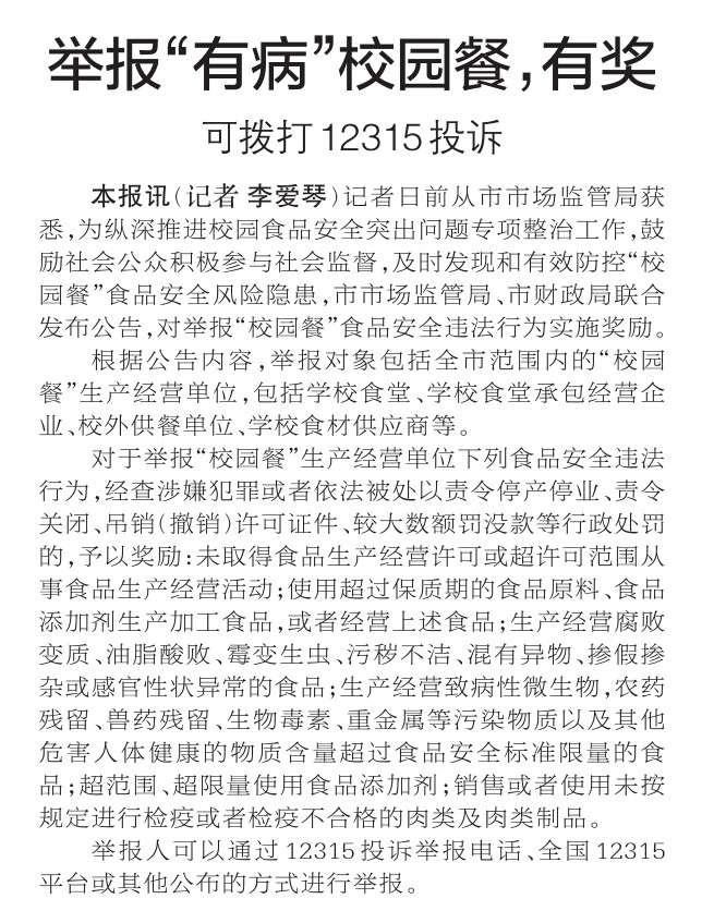 记者日前从市市场监管局获悉,为纵深推进校园食品安全突出问题专项整治工作,鼓励社会公众积极参与社会监督,及时发现和有效防控“校园餐”食品安全风险隐患,市市场监管局、市财政局联合发布公告,对举报“校园餐”食品安全违法行为实施奖励。(今日《郑州日报》2版)