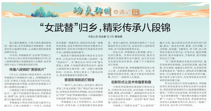 10年前,李晓瑜放弃“女武替”的漂泊工作,归乡加入到少林武术馆的教练员行列,在八段锦的舒展之间演绎新的人生精彩,也在秀美的少室山下体验着安适和自然。(今日《郑州日报》2版)