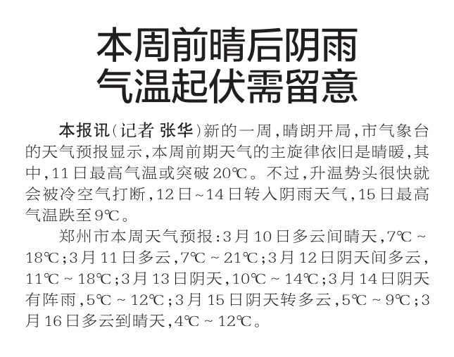 新的一周,晴朗开局,市气象台的天气预报显示,本周前期天气的主旋律依旧是晴暖,其中,11日最高气温或突破20℃。不过,升温势头很快就会被冷空气打断,12日~14日转入阴雨天气,15日最高气温跌至9℃。(今日《郑州日报》2版)