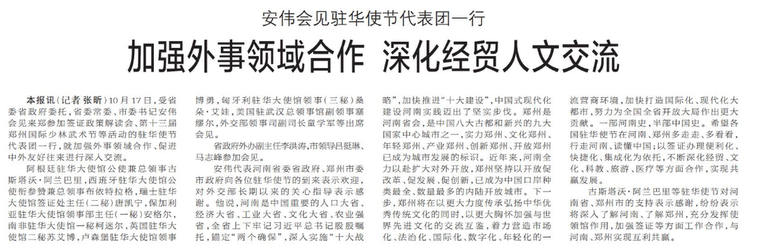10月17日,受省委省政府委托,省委常委、市委书记安伟会见来郑参加签证政策解读会、第十三届郑州国际少林武术节等活动的驻华使节代表团一行,就加强外事领域合作、促进中外友好往来进行深入交流。(今日《郑州日报》1版)