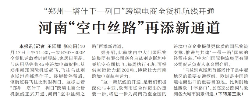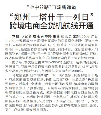 10月17日上午11:30,一架B767-300F全货机运载着时尚服装、家居日用品、节庆用品等共45吨跨境电商货物,从郑州新郑国际机场起飞,飞往乌兹别克斯坦首都塔什干。经短暂停留后,该航班将飞往比利时列日。这标志着“郑州—塔什干—列日”跨境电商全货机航线正式开通,河南“空中丝绸之路”再添新通道。(今日《河南日报》1版、3版)