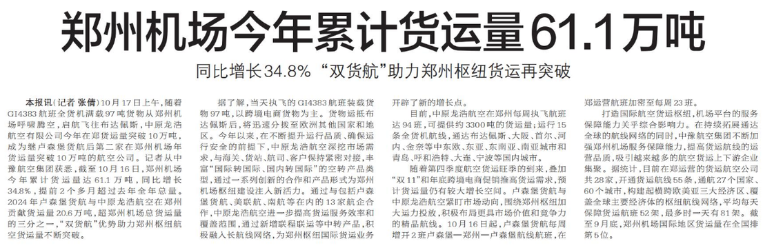 10月17日上午,随着GI4383航班全货机满载97吨货物从郑州机场呼啸腾空,启航飞往布达佩斯,中原龙浩航空有限公司今年在郑货运量突破10万吨,成为继卢森堡货航后第二家在郑州机场年货运量突破10万吨的航空公司。记者从中豫航空集团获悉,截至10月16日,郑州机场今年累计货运量达61.1万吨,同比增长34.8%,提前2个多月超过去年全年总量。2024年卢森堡货航与中原龙浩航空在郑州贡献货运量20.6万吨,超郑州机场总货运量的三分之一,“双货航”优势助力郑州枢纽航空货运量不断突破。(今日《郑州日报》2版)