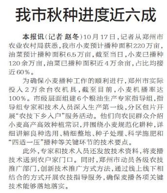 10月17日,记者从郑州市农业农村局获悉,我市小麦预计播种面积220万亩,油菜预计播种面积6.5万亩,截至当日,小麦已播种120余万亩,油菜已播种面积近4万余亩,占比均接近60%。(今日《郑州日报》2版)