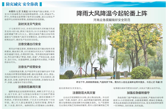 据河南省气象台预报,17日至20日我省将先后出现较明显降雨、大风、降温天气。昨日,河南省应急管理厅发布安全提醒,请公众和生产经营单位时刻保持警惕,提前做好防范措施。(今日《郑州日报》5版)