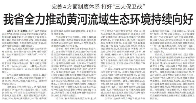 昨日,省政府新闻办召开“黄河流域生态保护和高质量发展”系列第五场新闻发布会,介绍我省近年来深入打好黄河生态保护治理攻坚战,统筹推进减污降碳协同增效,不断加强生态保护修复,推动黄河流域生态环境持续改善。(今日《郑州日报》6版)