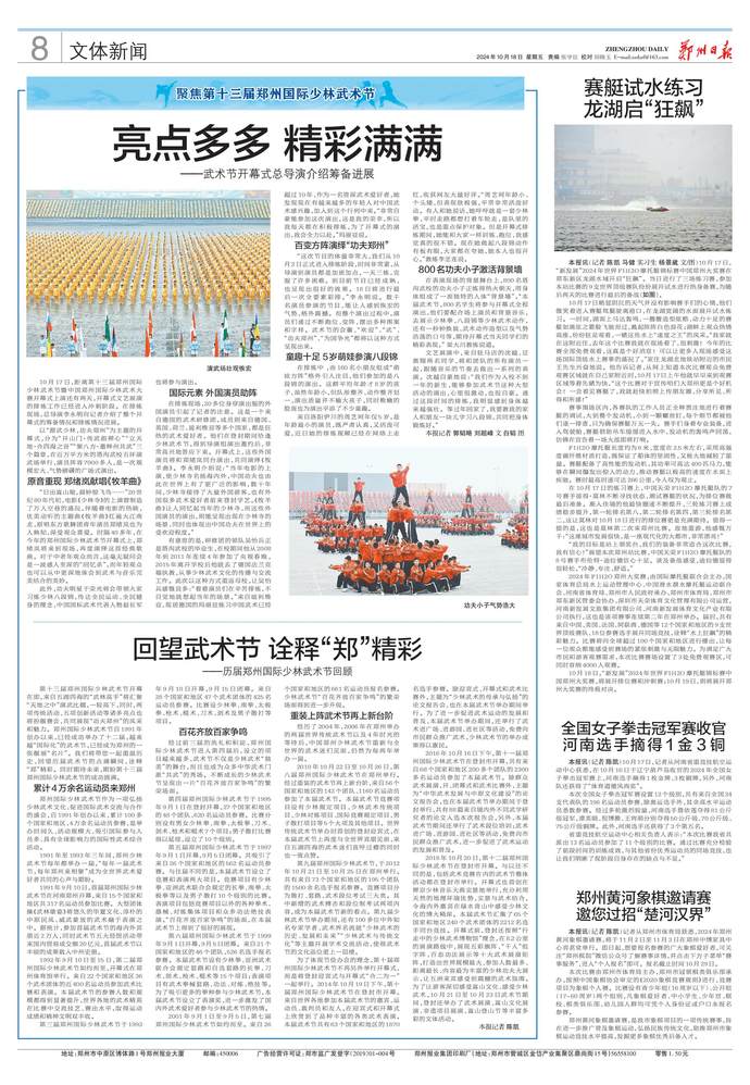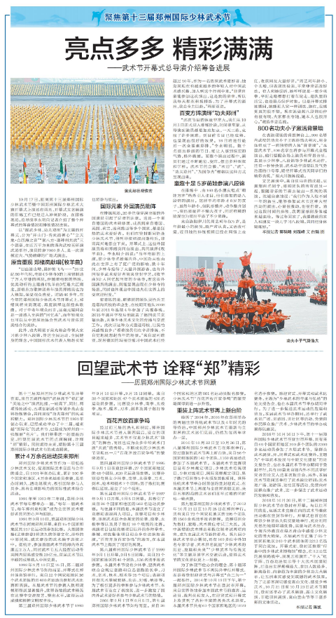第十三届郑州国际少林武术节开幕在即,来自五湖四海的“武林高手”将汇聚“天地之中”演武比擂,一较高下,同时,两项传统活动、五项创新活动等诸多亮点也将扮靓赛会,共同展现“功夫郑州”的风采和魅力。郑州国际少林武术节自1991年创办以来,已经成功举办了十二届,越来越“国际化”的武术节,已经成为郑州的一张靓丽“名片”。我们将带您一起重温历史,回望历届武术节的点滴瞬间,诠释“郑”精彩。同时期待未来,期盼第十三届郑州国际少林武术节的成功圆满。(今日《郑州日报》8版)