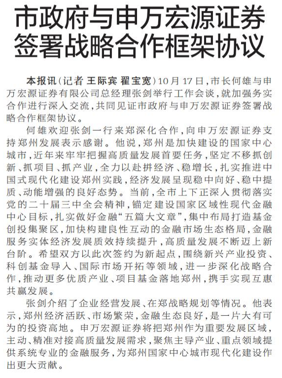 10月17日,市长何雄与申万宏源证券有限公司总经理张剑举行工作会谈,就加强务实合作进行深入交流,共同见证市政府与申万宏源证券签署战略合作框架协议。(今日《郑州日报》1版)