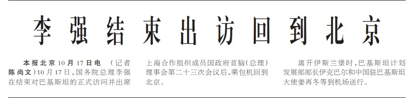 10月17日,国务院总理李强在结束对巴基斯坦的正式访问并出席上海合作组织成员国政府首脑(总理)理事会第二十三次会议后,乘包机回到北京。(今日《人民日报》1版)