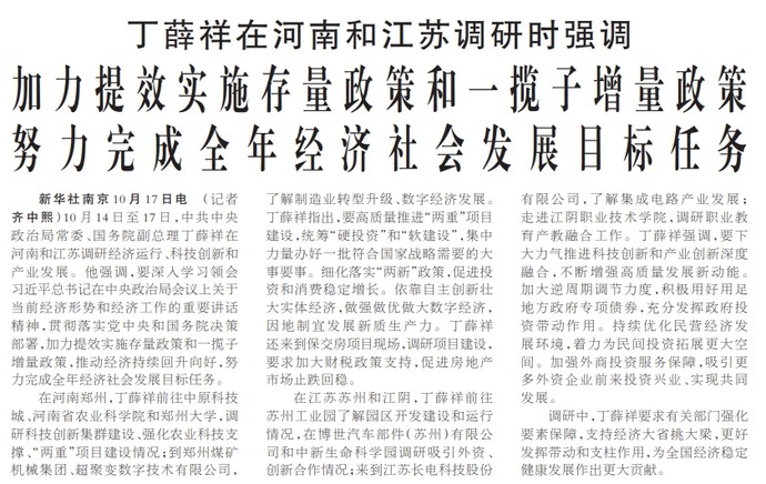 10月14日至17日,中共中央政治局常委、国务院副总理丁薛祥在河南和江苏调研经济运行、科技创新和产业发展。他强调,要深入学习领会习近平总书记在中央政治局会议上关于当前经济形势和经济工作的重要讲话精神,贯彻落实党中央和国务院决策部署,加力提效实施存量政策和一揽子增量政策,推动经济持续回升向好,努力完成全年经济社会发展目标任务。(今日《人民日报》1版)