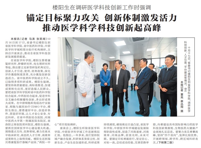 10月16日到17日,省委书记楼阳生到省医学科学院、省中医药科学院、中原医学科学城和部分医疗机构调研,主持召开座谈会,推动全省医学科技创新发展提质提速。(今日《河南日报》1版、2版)