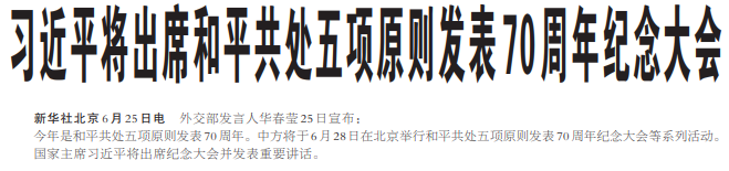 今年是和平共处五项原则发表70周年。中方将于6月28日在北京举行和平共处五项原则发表70周年纪念大会等系列活动。(今日《人民日报》1版)