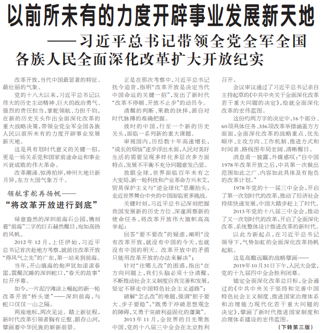 党的十八大以来,习近平总书记以伟大的历史主动精神、巨大的政治勇气、强烈的责任担当,掌舵领航、力担千钧,在新的历史关头作出全面深化改革的重大战略决策,带领全党全军全国各族人民以前所未有的力度开辟事业发展新天地。(今日《人民日报》1版、3版)