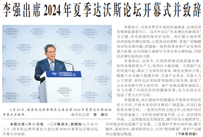 6月25日上午,国务院总理李强在大连出席2024年夏季达沃斯论坛开幕式并致辞。(今日《人民日报》1版、4版)