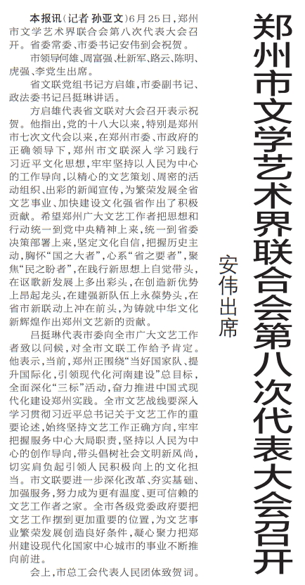 6月25日,郑州市文学艺术界联合会第八次代表大会召开。省委常委、市委书记安伟到会祝贺。