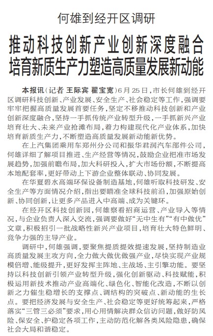 6月25日,市长何雄到经开区调研科技创新、产业发展、安全生产、社会稳定等工作,强调要牢牢把握高质量发展首要任务,坚定不移推动科技创新和产业创新深度融合,坚持一手抓传统产业转型升级,一手抓新兴产业培育壮大、未来产业抢滩布局,着力构建现代化产业体系,加快培育新质生产力,不断塑造高质量发展新动能新优势。(今日《郑州日报》1版)