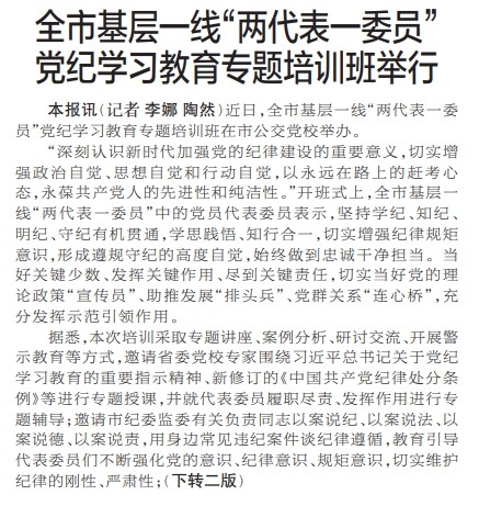 近日,全市基层一线“两代表一委员”党纪学习教育专题培训班在市公交党校举办。(今日《郑州日报》1版、2版)