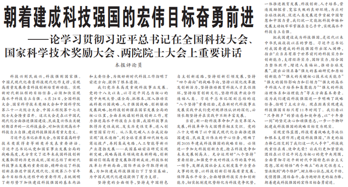 科技兴则民族兴,科技强则国家强。中国式现代化要靠科技现代化作支撑,实现高质量发展要靠科技创新培育新动能。实现新时代新征程的目标任务,必须加快实现高水平科技自立自强。6月24日,全国科技大会、国家科学技术奖励大会和中国科学院第二十一次院士大会、中国工程院第十七次院士大会隆重召开。这次大会是在以中国式现代化全面推进强国建设、民族复兴伟业关键时期召开的一次科技盛会,对加快实现高水平科技自立自强、建设科技强国具有重大意义。(今日《人民日报》2版)