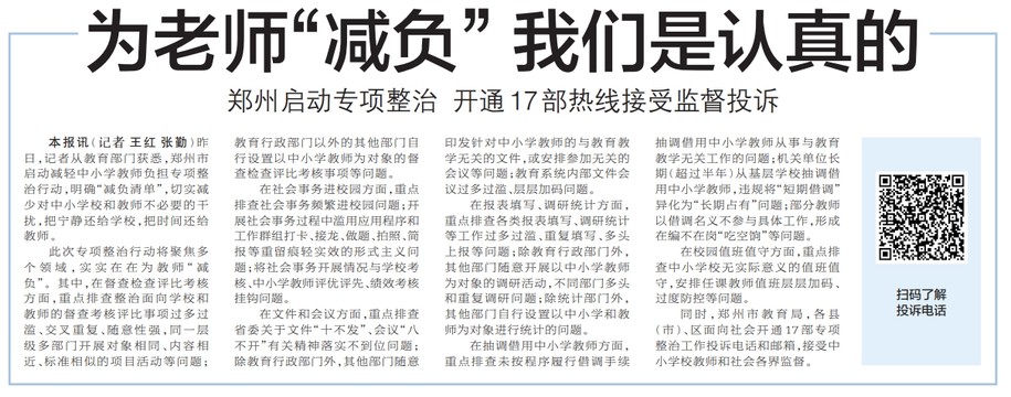 昨日,记者从教育部门获悉,郑州市启动减轻中小学教师负担专项整治行动,明确“减负清单”,切实减少对中小学校和教师不必要的干扰,把宁静还给学校,把时间还给教师。(今日《郑州日报》2版)