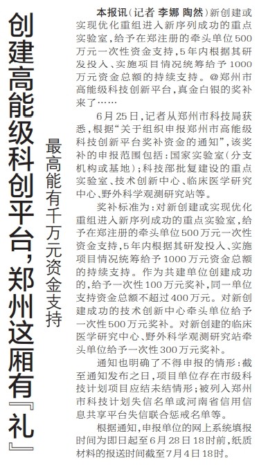 新创建或实现优化重组进入新序列成功的重点实验室,给予在郑注册的牵头单位500万元一次性资金支持,5年内根据其研发投入、实施项目情况统筹给予1000万元资金总额的持续支持。@郑州市高能级科技创新平台,真金白银的奖补来了……(今日《郑州日报》2版)