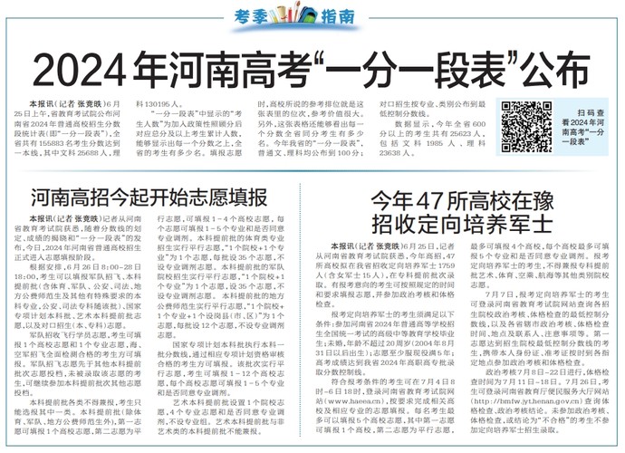 记者从河南省教育考试院获悉,随着分数线的划定、成绩的揭晓和“一分一段表”的发布,今日,2024年河南省普通高校招生正式进入志愿填报阶段。(今日《郑州日报》5版)
