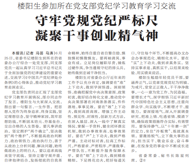 6月25日,省委书记楼阳生到所在的省委办公厅综合一处党支部,同支部党员一起认真学习习近平总书记关于全面加强党的纪律建设的重要论述,交流学习《中国共产党纪律处分条例》的心得体会,推动党纪学习教育走深走实。(今日《河南日报》1版)