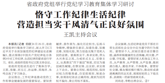 6月25日,省政府党组举行集体学习研讨,深入学习《习近平关于全面加强党的纪律建设论述摘编》,重点围绕《中国共产党纪律处分条例》中对工作纪律、生活纪律的要求进行学习。省长、省政府党组书记王凯主持会议。(今日《河南日报》1版)