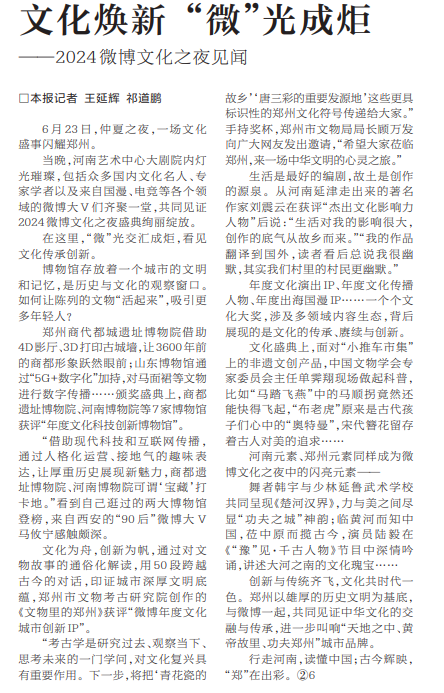 当晚,河南艺术中心大剧院内灯光璀璨,包括众多国内文化名人、专家学者以及来自国漫、电竞等各个领域的微博大V们齐聚一堂,共同见证2024微博文化之夜盛典绚丽绽放。(今日《河南日报》6版)