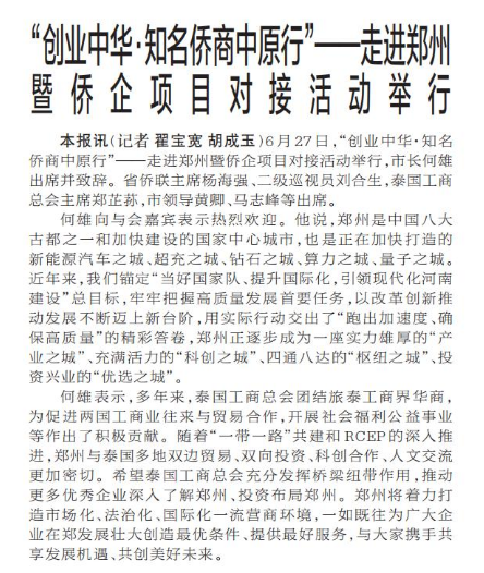 6月27日,“创业中华·知名侨商中原行”——走进郑州暨侨企项目对接活动举行,市长何雄出席并致辞。省侨联主席杨海强、二级巡视员刘合生,泰国工商总会主席郑芷荪,市领导黄卿、马志峰等出席。(今日《郑州日报》1版)