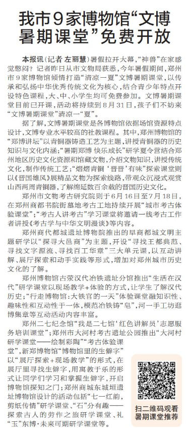 暑假拉开大幕,“神兽”在家感觉憋闷?记者昨日从市文物局获悉,今年暑假期间,郑州市9家博物馆倾情打造“清凉一夏”文博暑期课堂,以传承和弘扬中华优秀传统文化为核心,结合青少年特点开设特色课程,大、中、小学生均可免费参加。文博暑期课堂目前已开课,活动将持续到8月31日,孩子们不妨来“文博暑期课堂”清凉一“夏”。(今日《郑州日报》1版)