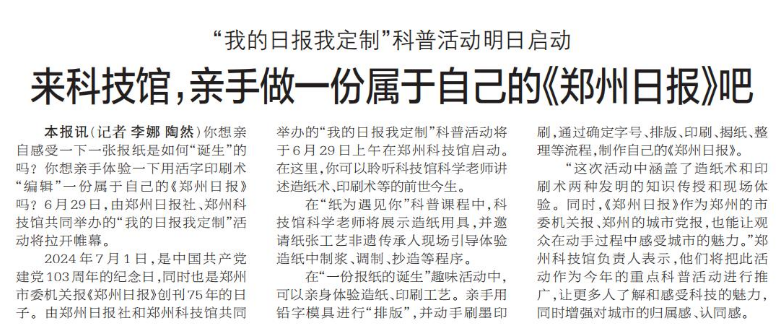 想亲自感受一下一张报纸是如何“诞生”的吗?你想亲手体验一下用活字印刷术“编辑”一份属于自己的《郑州日报》吗?6月29日,由郑州日报社、郑州科技馆共同举办的“我的日报我定制”活动将拉开帷幕。(今日《郑州日报》1版)