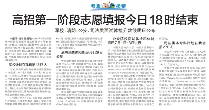 2024年河南高招第一阶段的志愿填报工作将于6月28日18:00截止,招生部门提醒考生,务必在规定时间内保存并提交志愿。军校、消防、公安、司法类招生面试、体检(体能测试)分数线将于6月29日公布,提醒考生届时上网查看,严格按照相关流程安排参与面试、体检(体能测试)。(今日《郑州日报》2版)