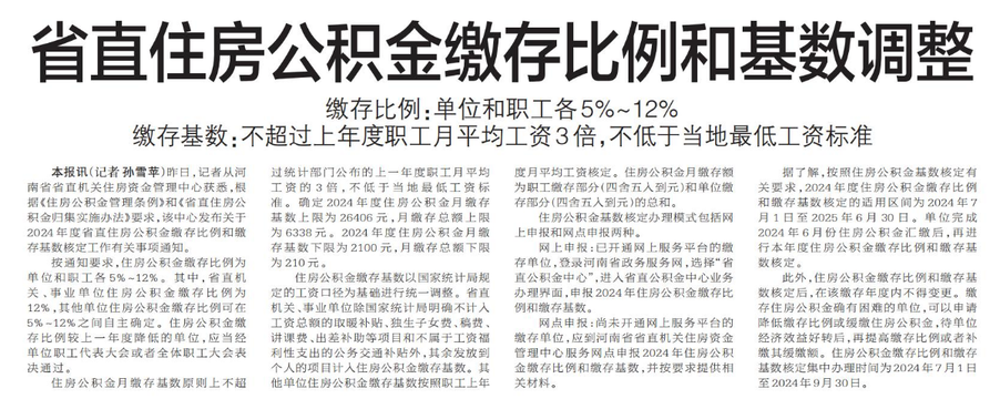 昨日,记者从河南省省直机关住房资金管理中心获悉,根据《住房公积金管理条例》和《省直住房公积金归集实施办法》要求,该中心发布关于2024年度省直住房公积金缴存比例和缴存基数核定工作有关事项通知。(今日《郑州日报》5版)