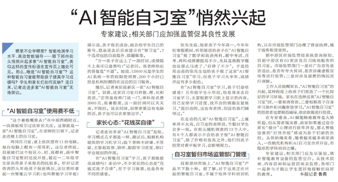 哪里不会学哪里?智能检测学习水平、高效智能辅导……眼下郑州街头悄然兴起多家“AI智能自习室”,类似这样的宣传标语在宣传页上随处可见。那么,啥是“AI智能自习室”?这种智能自习室能帮助孩子提高学习成绩吗?学生和家长们如何反映?连日来,记者走进多家“AI智能自习室”实地探访。(今日《郑州日报》5版)