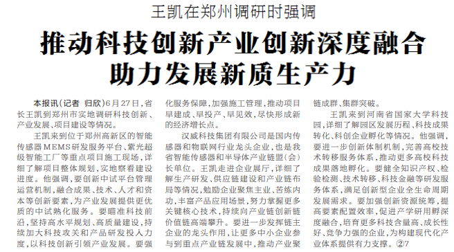 6月27日,省长王凯到郑州市实地调研科技创新、产业发展、项目建设等情况。(今日《河南日报》1版)