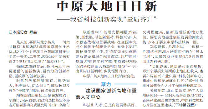 亮眼成绩的背后,是河南近年来更迅猛的创新势头、更有力的创新举措、更浓厚的创新氛围。(今日《河南日报》1版、4版)