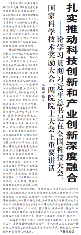 “中国式现代化要靠科技现代化作支撑,实现高质量发展要靠科技创新培育新动能。”在全国科技大会、国家科学技术奖励大会、两院院士大会上,习近平总书记精辟论述了科技的战略先导地位和根本支撑作用,围绕“扎实推动科技创新和产业创新深度融合,助力发展新质生产力”作出了重大部署,深刻阐明了融合的基础、融合的关键、融合的途径。(今日《人民日报》1版、3版)
