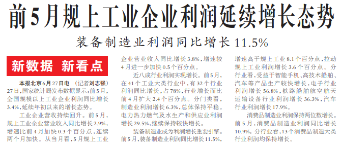 27日,国家统计局发布数据显示:前5月,全国规模以上工业企业利润同比增长3.4%,延续年初以来的增长态势。(今日《人民日报》1版)