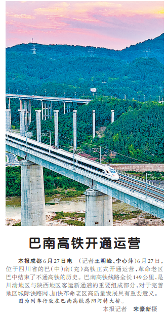6月27日,位于四川省的巴(中)南(充)高铁正式开通运营,革命老区巴中结束了不通高铁的历史。巴南高铁线路全长149公里,是川渝地区与陕西地区客运新通道的重要组成部分,对于完善地区城际铁路网、加快革命老区高质量发展具有重要意义。(今日《人民日报》1版)