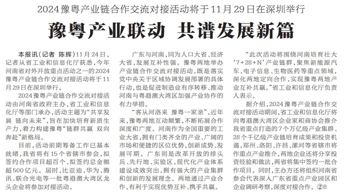 11月24日,记者从省工业和信息化厅获悉,今年河南省对外开放重点活动之一的2024豫粤产业链合作交流对接活动将于11月29日在深圳举行。(今日《河南日报》1版)