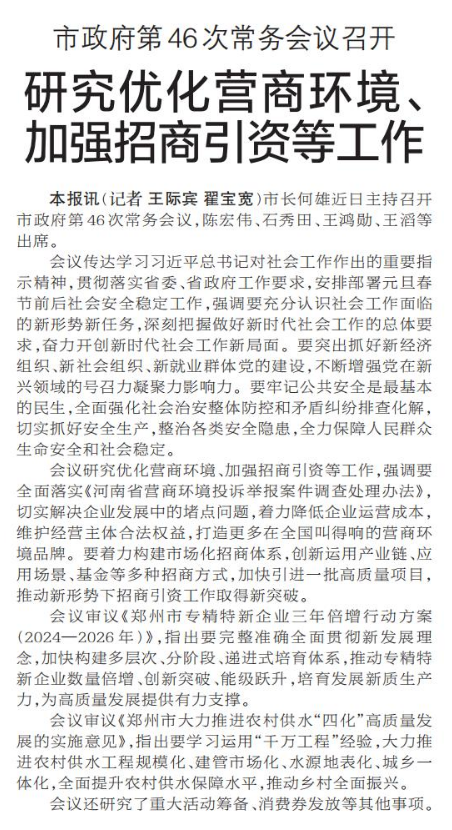 市长何雄近日主持召开市政府第46次常务会议,陈宏伟、石秀田、王鸿勋、王滔等出席。